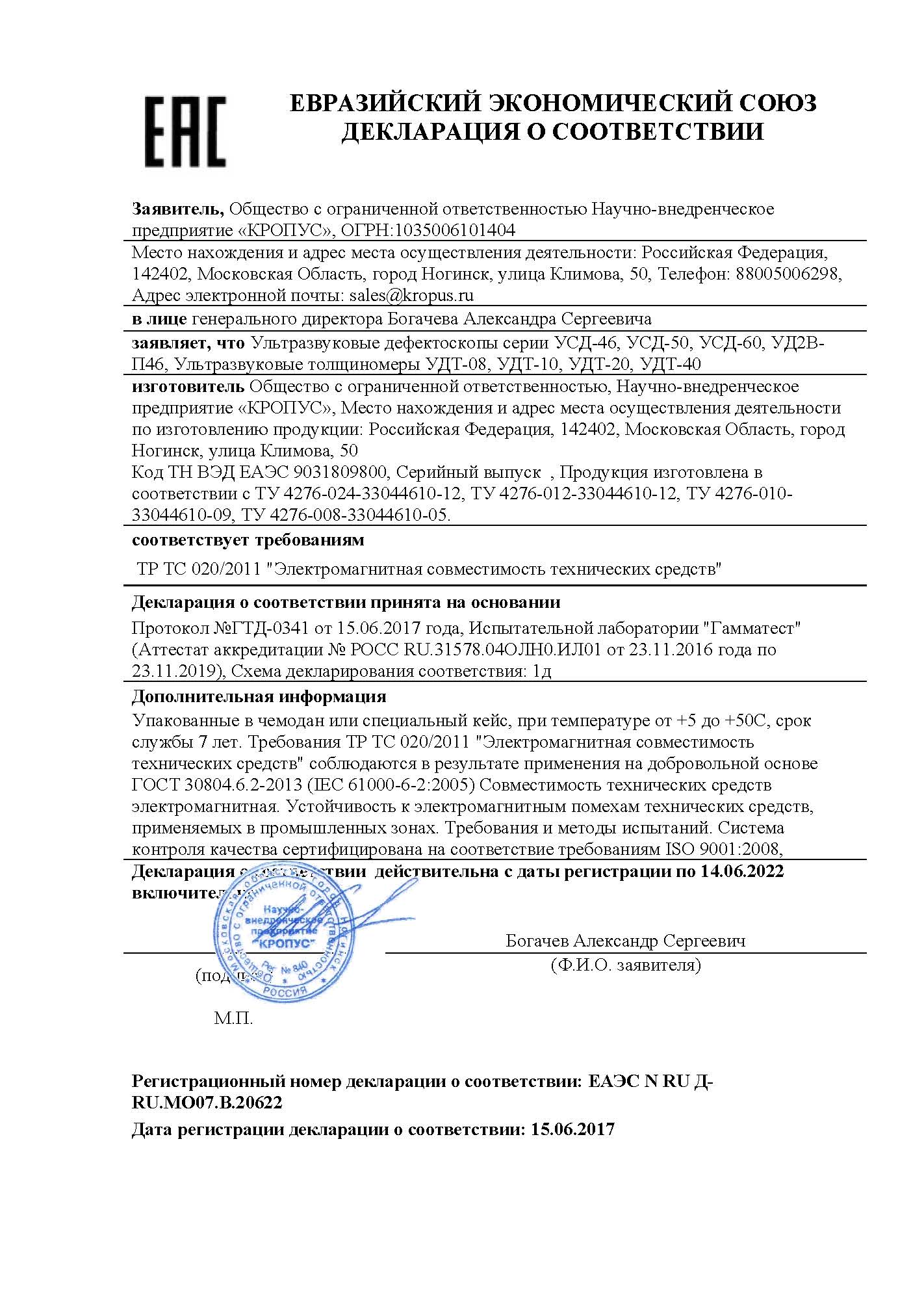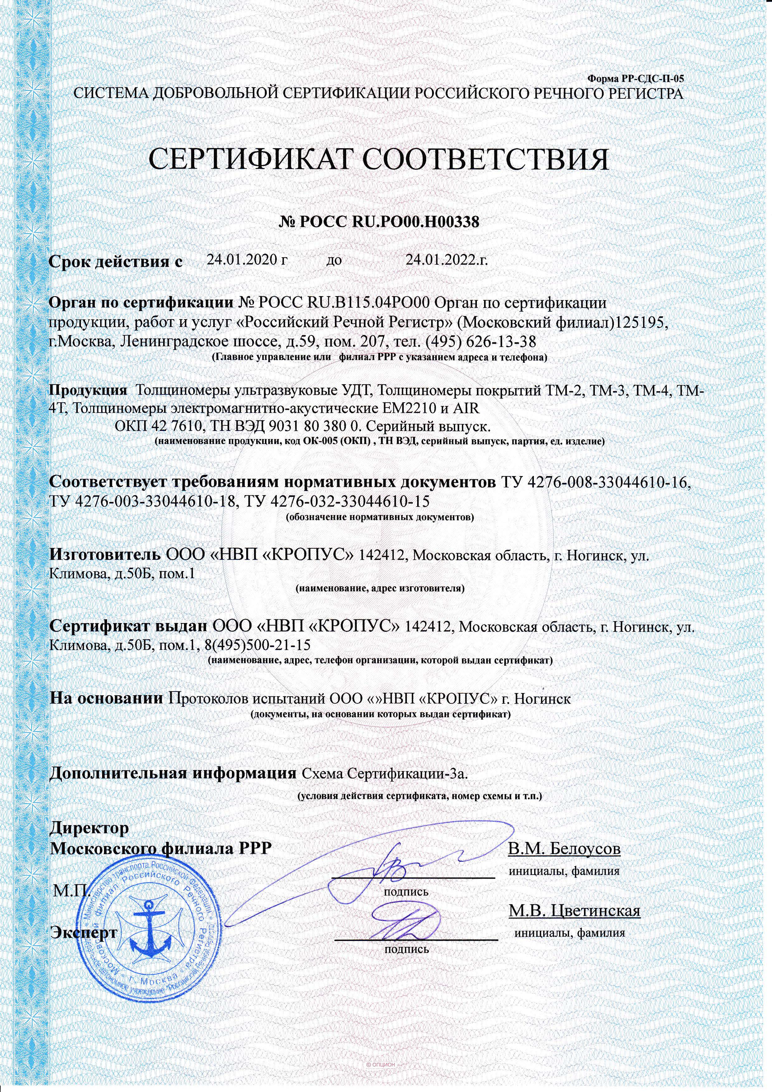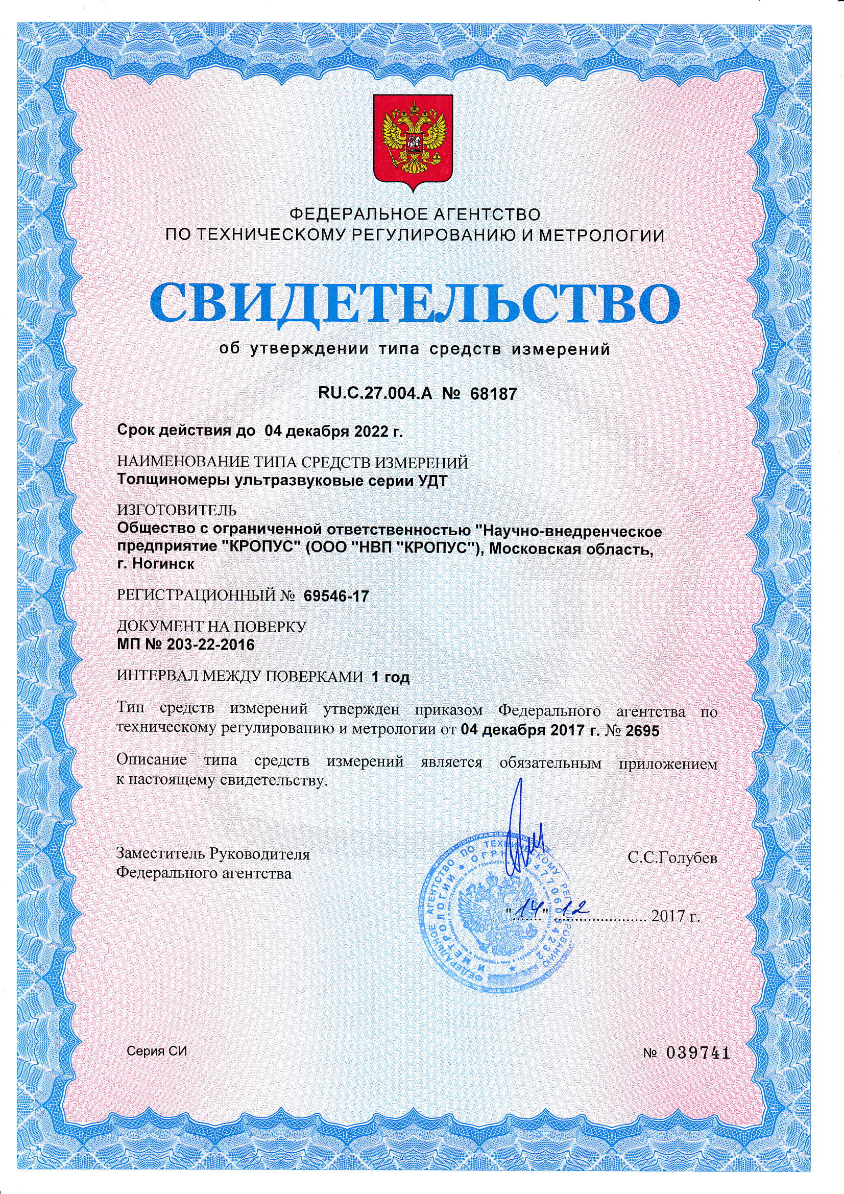 Сертификат Госстандарта России RU.C.27.003.A №43062, ультразвуковой толщиномер зарегистрирован в Государственном реестре средств измерений под №31416-11 и допущен к применению в Российской Федерации.
